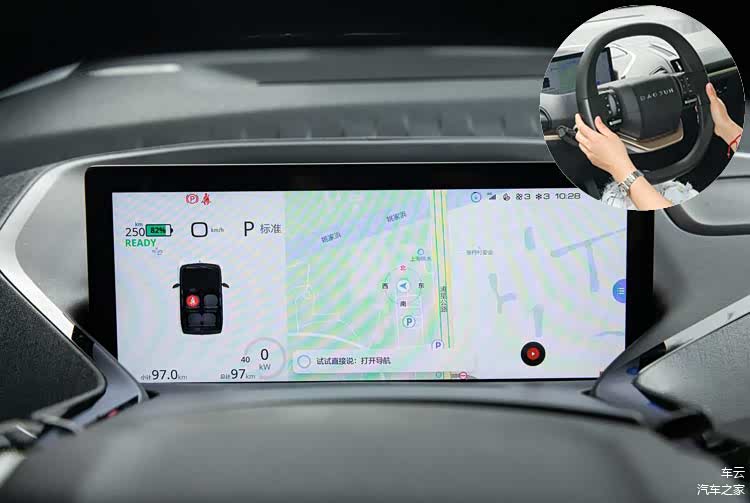 首先想和大家介绍的,便是KiWi EV在仪表盘和中控屏方面的创新。前面说到,受限于成本,KiWi EV采用了中控屏和仪表屏相融合的理念,位置设计在传统仪表盘处。那么问题来了,在不能够触控屏幕的前提下,要如何实现功能的控制呢?宝骏的工程师们给出了两种解决方法,其一是车主可以通过方向盘上的触控键,来控制中控屏的内容;第二种则是通过语音方式,进行例如目的地、歌曲的搜索,车主都可以通过“说”的方式来和车机互动。