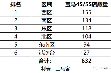 截止2022年1月13日,宝马客从宝马官网数据统计出,全中国有632家宝马4S店(包含港澳台)。按照宝马在华经销商系统分区,西区宝马4S店合计155家;南区合计134家;东区合计118家;北区合计104家;东南区合计94家;港澳台地区合计27家。
