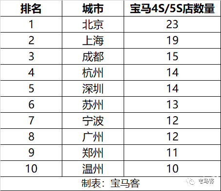 全中国宝马4S店最多的城市是:北京市,合计拥有23家宝马4S店.