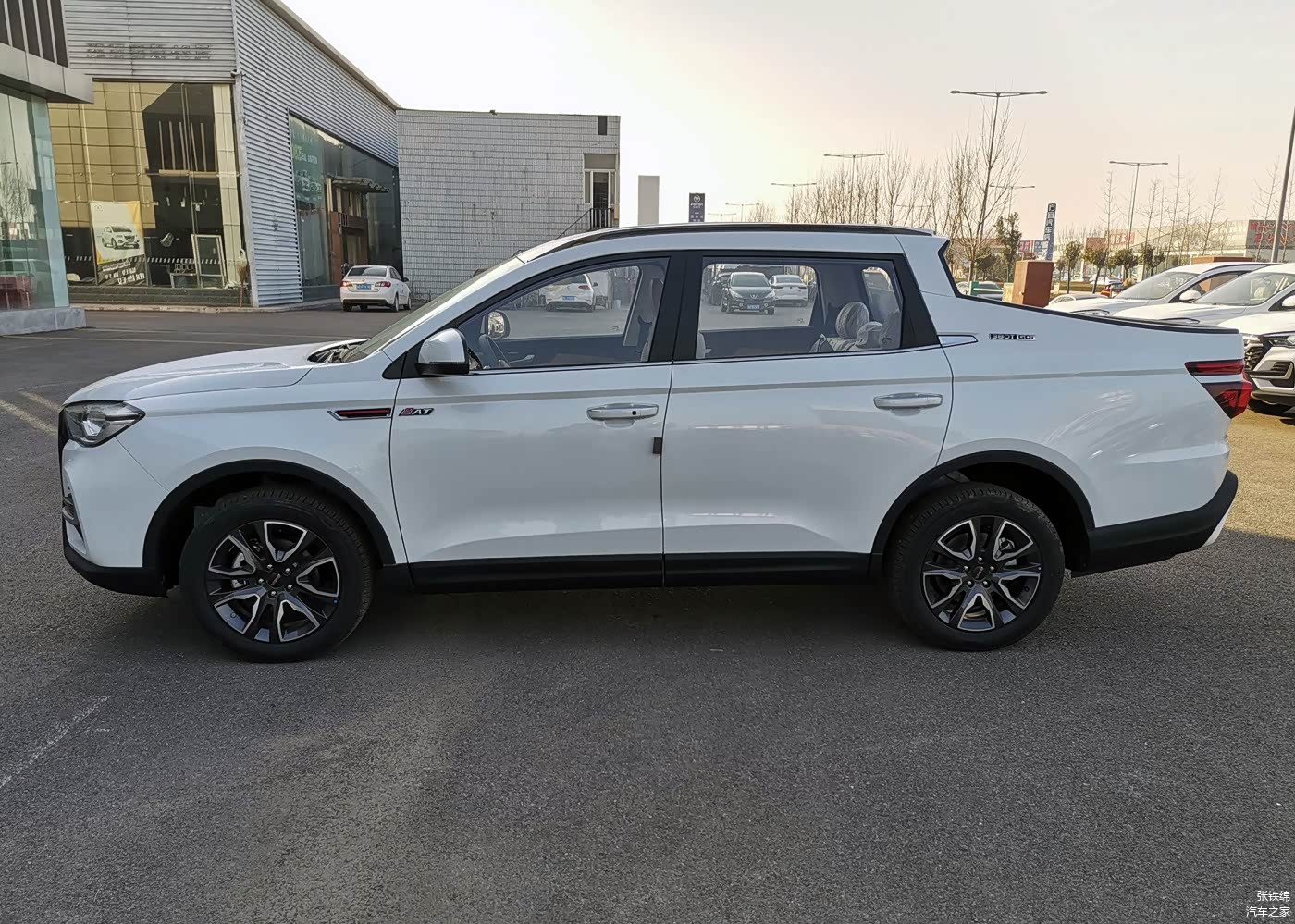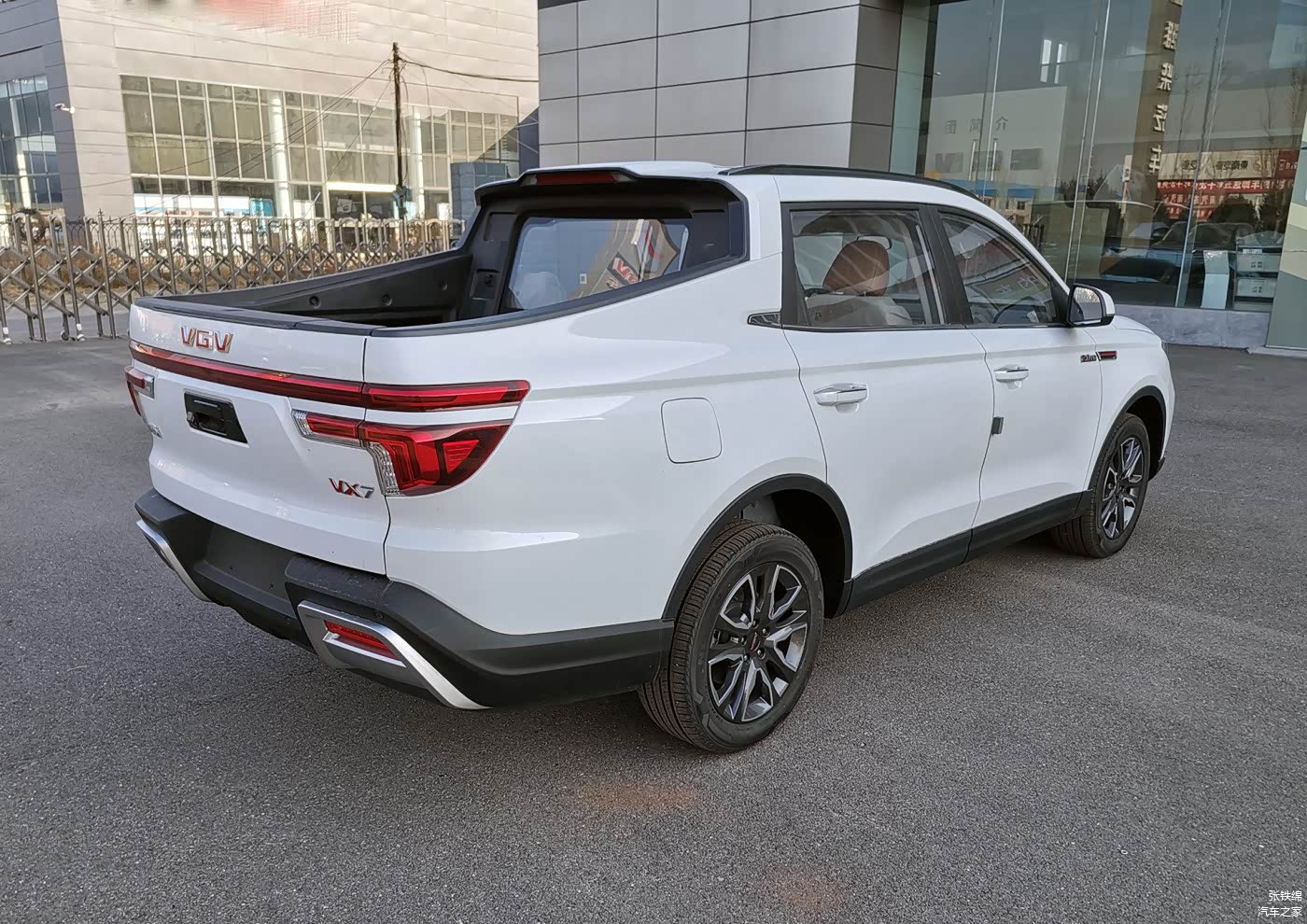 虽然也是基于SUV平台而来,但是这辆VGV VX7的侧面造型明显要比吉利远程FX7更为自然协调,并不是简单的在SUV后面价格斗,C柱和后斗的造型融合度很好,造型也很运动个性。尺寸上,新车长宽高分别为5015/1870/1732mm,轴距为2800mm。