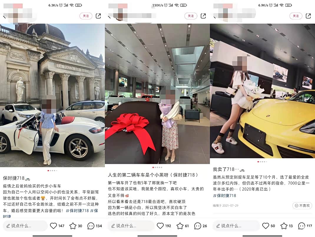 小红书中不乏充斥着这种轻描淡写的炫富笔记。当然在这些炫富的用户中,不排除有真正的富二代、白富美以及真名媛。其在物质上得到极大满足后,便在网上寻找精神认同和羡慕,然而这种情况可谓是少之又少,在看到这类笔记的时候,读者对大多数自称保时捷用户的博主还需要打一个问号。