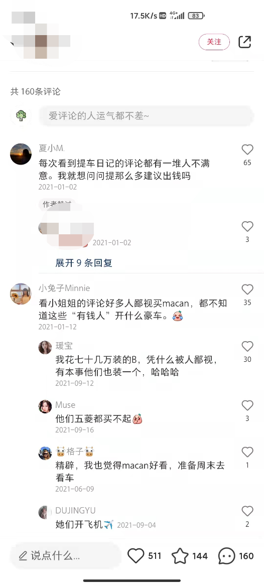 而作为超豪华品牌,保时捷的表现无疑是成功的,但是纵观旗下车型的销量,不难发现,保时捷的主要销量得益于最低售价仅50多万元的Macan,达8.8万台,其次便是最低售价91万的卡宴,累销达8.3万台。因此网上经常出现不乏针对保时捷是否属于超豪华品牌的讨论。而在小红书app中,有博主分享新入手的Macan(不确定是否是真实车主),楼下就有许多人鄙视Macan车主。