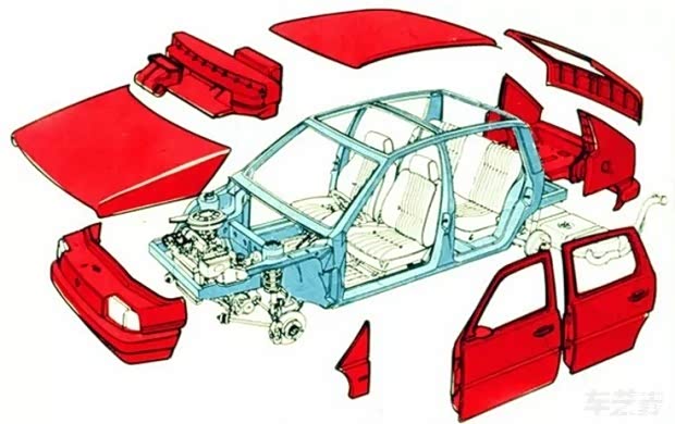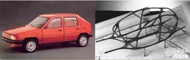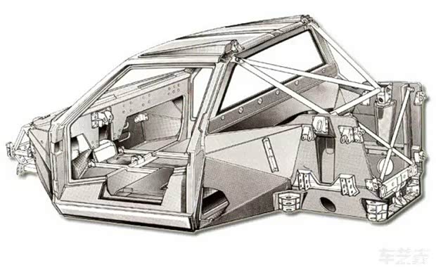ECV是英文Experimental Composite Vehicle的缩写,其车身结构设计理念来源于Fiat于1981年开发的VSS(Experimental SpaceframeXSS Vehicle)计划,其实就是使用空心钢管建造的无结构车身,底盘为塑料制作用作覆盖物遮住防撞梁,外观覆盖件则安装在这个钢管结构的车身上。这种理念在ECV上体现其实就是独立的驾驶室结构,加上用于支撑车壳和转向机构的一些复合材料(大量的碳纤维和凯夫拉材料)组成的承载式车身,具体只需看下面两张图就有很直观的感受。*图一为VSS,图二为ECV。