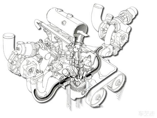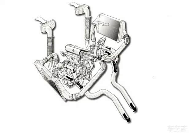 然后涡轮问题解决了接下来工程师面对的是这具发动机独特设计后的一系列散热问题。好在其设计在带来高热量的同时也留下了大量空间用于排布进气和出气歧管的排布,对散热十分有利。空气流通过竖置发动机顶盖后经由交叉进气歧管畅通无阻;大空间可使用两个巨大的中冷各自为单独一个涡轮进行冷却;可以使用优化的涡轮泄压阀设计或者干脆把两个涡轮合用一个泄压阀;这样的管道排布使得发动机低转速有高扭力,高转速时启动第二个涡轮介入工作提供高功率输出。其实更奇葩的是这两个涡轮可以使用不同大小,在不同的转速区间满足不同需求。