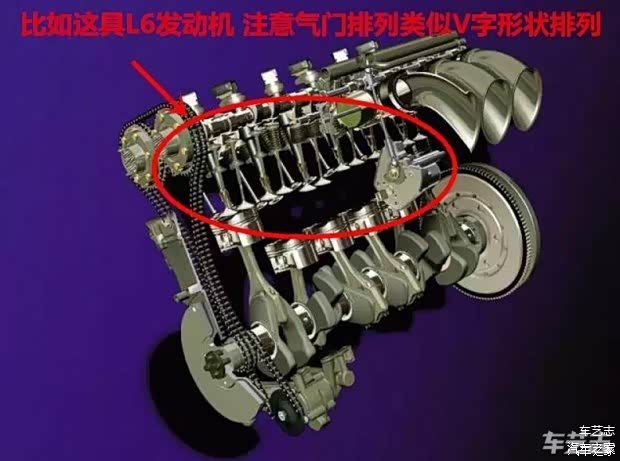通常发动机气门排列分为两排,一左一右对应一进一出,但是ECV配备的这具Triflux发动机气门却是交叉排列,这种气门排列方式适用于自然吸气(NA)和涡轮增压(TC)两种发动机。在高性能发动机中使用涡轮在当时有两个瓶颈,大涡轮的涡轮迟滞(Turbo Lag)效应严重,极大影响赛车在升挡时的速度,而小涡轮由于技术原因— L4发动机使用常规双排气门排列无法同时运作两个涡轮,那么问题就来了~!*黑白色图为交叉排列的Triflux发动机气门 彩色的这具L6发动机气门从侧面看类似于V字形状。