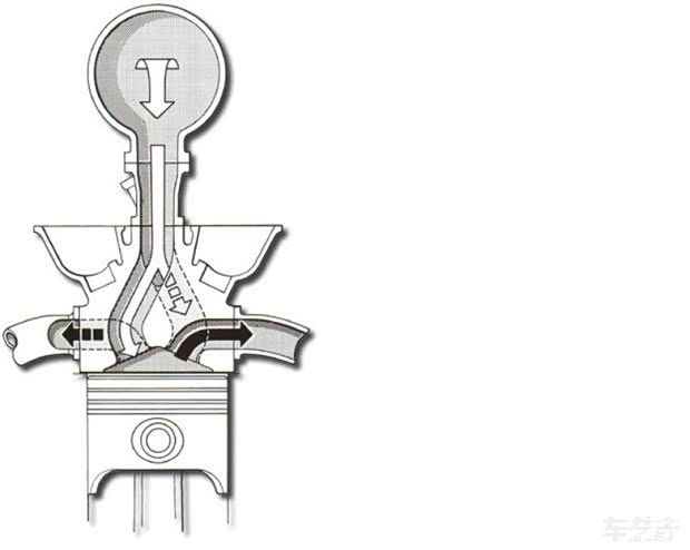 Abarth的工程师就使用了上面黑白图片的特殊交叉状气门设计,每汽缸4气门(通常每汽缸2气门),使得L4发动机使用两个小涡轮成为可能,这样既减少了涡轮迟滞又能提供足够的增压值压榨发动机性能极限。这种类似于倒Y形的排列使得空气分两股从两个气门进入汽缸,在燃烧后由另外两个气门打开并流入两个方向的两个涡轮中,真是太机智了!*具体运作可以看下图,仔细看就能看见每个缸上双凸轮轴带动着4个气门呈正方型排列,对角成对,两进两出。