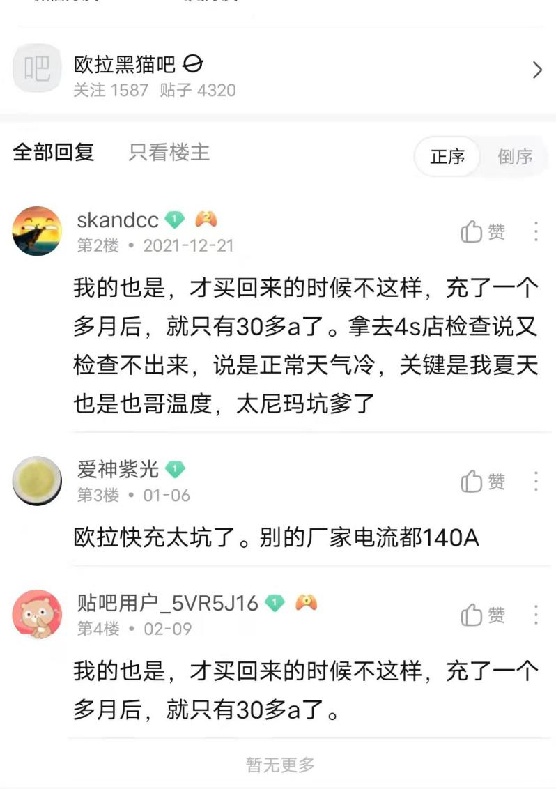 “以前充电一百安左右,而现在最高只有60安。”车主声称这绝不是因为冬天的问题,因为同样的温度及电量时,欧拉黑猫的充电电流仅有40多安,而其他车辆的充电电流却有130多安。“这也好意思叫快充?”该车主称,自己的车充电速度实在是太慢了,并不是自己一个人最近发现有这个问题,而是很多车主都发现了。