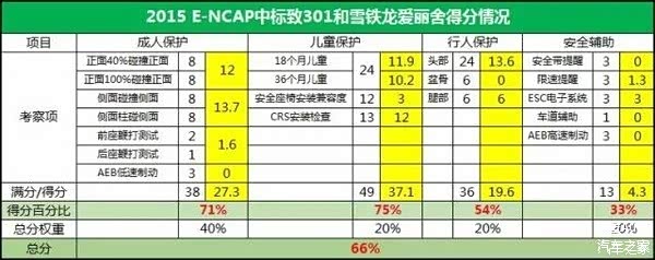 雪铁龙Berlingo、标致Partner在国内没有销售,暂且不去管。从301和爱丽舍(两款车型的得分完全相同,后文只以301为例)各项得分上来看,它主要是输在了“安全装备”这一考核项上。E-NCAP的星级评级是逐项+总分要求的,一个大项达不到,其他表现再好,五星也别指望。