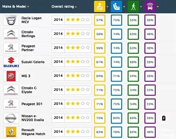 瞎逛的时候,看到了2014年E-NCAP做过测试的所有车型榜单,排名靠前的予墨没多少兴趣,俺只喜欢看热闹。一看不要紧,2014年一共诞生了9款获得三星的车型,来自法国的PSA集团的产品,居然就占了4款!在国内也已经上市的标致301、雪铁龙爱丽舍也位列其中。作为一名东风标致现役车主,予墨表示很震惊很好奇啊。PSA咋了这是?