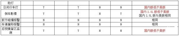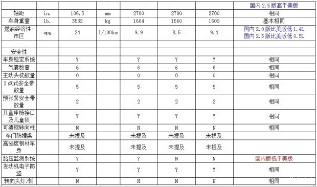 6. 被动安全。国内2.0L版在车身稳定系统、气囊数量、安全带配置等方面与美版相同;在胎压监测系统、日间行车灯、倒车影像、后视镜盲区监测方面配置低于美版。国内2.5L版在车身稳定系统、气囊数量、安全带配置、倒车影像等方面与美版相同;在胎压监测系统、日间行车灯、后视镜盲区监测方面配置低于美版,在转向头灯方面高于美版。