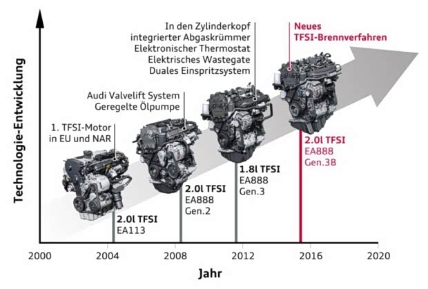 想必大家也知道EA888是大众集团1.8T和2.0T主力汽油发动机系列。刚刚开始在2015款的奥迪Q5和大众凌度上装配第三代EA888发动机。大部分的车型比如帕萨特、速腾、途观等等使用的还是第二代EA888发动机。奥迪现在怎么就一下子提出了三代半的EA888了呢?其实虽然奥迪与大众共享发动机平台,但是奥迪品牌自身有很多独特的发动机技术。比如同是使用第二代的EA888,装配在奥迪车型上的EA888就被加入了可变气门升程VVL(Variable Valve Lift)控制功能,奥迪称为AVS (AudiValvelift System)。而在第三代EA888发动机里奥迪的AVS技术变成了标配,大众集团的所有车型都能够共享该技术。奥迪当然不甘沉默,提出了适度尺寸理念和三代半的EA888 (Gen.3B)。如下就是大众集团1.8T和2.0T的发动机技术路线图(横轴为年份,纵轴为技术研发方向)。