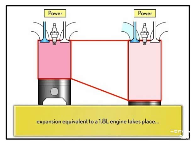 首先之前提到过米勒/阿特金森循环发动机的显著特征就是压缩行程短,膨胀行程长。那么在下面的两张发动机工作原理图中就体现为传统发动机(左侧)进气冲程容积和做功冲程容积相同,而阿特金森发动机(右侧)进气冲程容积小于做功冲程容积。