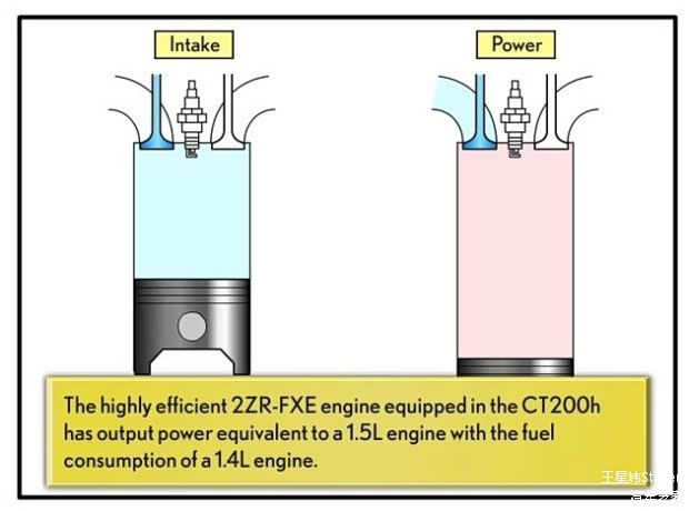 其实奥迪并非第一个提出使用米勒/阿特金森循环发动机的车企,如果大家关心混合动力汽车的话就会发现很早丰田就开始使用阿特金森循环发动机。目前全球销量最大的混合动力汽车丰田普锐斯使用的就是阿特金森循环发动机。并且目前几乎丰田集团全系混合动力汽车包括丰田凯美瑞2.5h,雷克萨斯CT200h,雷克萨斯NX300h都在使用类似的技术。那让我们借助雷克萨斯CT200h的一些官方介绍资料来解读一下米勒/阿特金森循环发动机的特点。