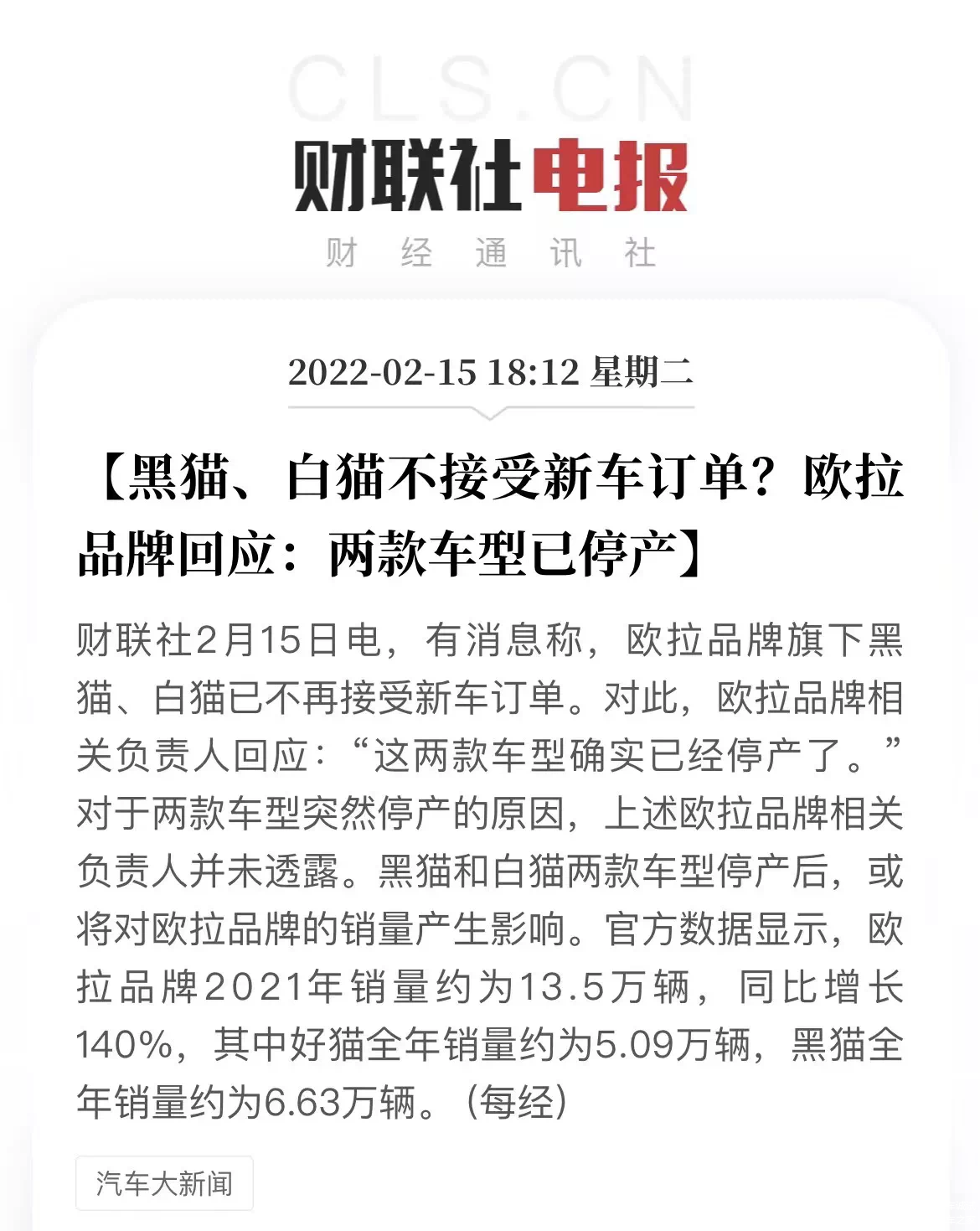 2月15日,欧拉汽车突然停产旗下黑猫和白猫两款车型的消息引发关注。据财联社报道:欧拉品牌旗下黑猫、白猫已不再接受新车订单。对此,欧拉品牌相关负责人也回应:“两款车型确实已经停产了。”而就在前一天,欧拉品牌的经销商就已经接到长城厂家的临时通知,表示从15日零点起要求经销商全部停止黑猫白猫车型的接单,并将宣传物料全部撤出,展车也全部撤出展厅。给经销商也来了个措手不及。