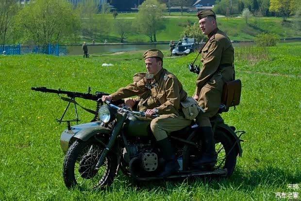 甚至在二战爆发前,斯大林看中了德军装备的宝马R71摩托,并力图通过正规渠道引进并国产化(此前已经有引进德军1、2号坦克技术改造T系列坦克的先例)。但是随之而来的闪击波兰并开启第二次世界大战,苏军偷运了5台R72系列摩托,交由乌拉尔厂逆向仿制。最终乌拉尔版“伊万斯基机”M-72边三轮摩托进入苏军服役。如上图所示,在二战重演真人秀中,苏军步兵驾驶,M-72三轮摩托、架着MG32机枪并搭乘侦察兵的形象极为真实。