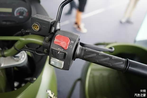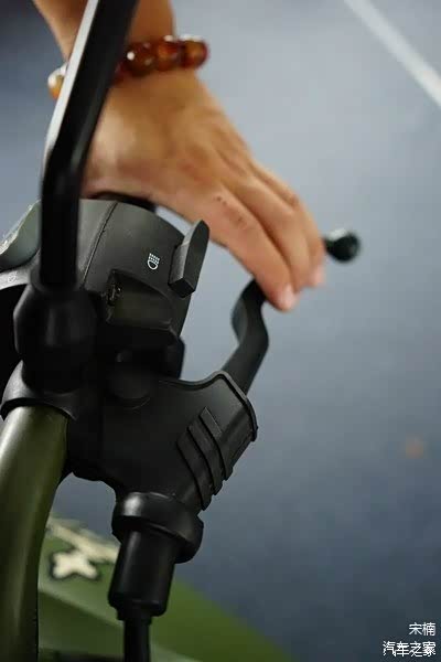 上图是JH600BJ转向车架右侧握把以及各开关特写。从上依次向下布置的开关为:红色电源启动开关(ACC)、黑色远近光开关、灰色车辆启动开关。旋转右侧握把即可加油(替代了汽车的油门踏板)。