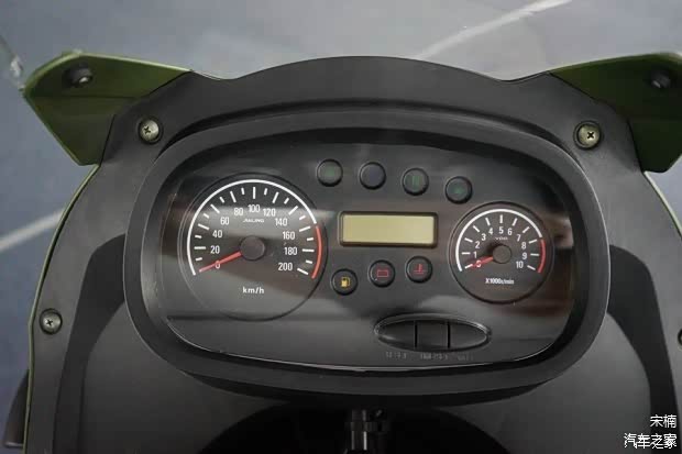 上图是JH600BJ的组合仪表特写。经过防水、防尘、密封处理的仪表由三组区域构成。左侧指针式时速表较大,便于驾驶员高速行驶中快速读取;右侧为较小的指针式发动机转速表;中央的单色显示屏可显示时间、总里程、单次行驶里程等参数。围绕单色显示屏上下排列着各4组功能指示灯,分别是(上左至上右):左转向灯、远近光灯、挡位指示灯和右转向灯;(下左至右)燃油警告灯、电源指示灯和水温警告灯。