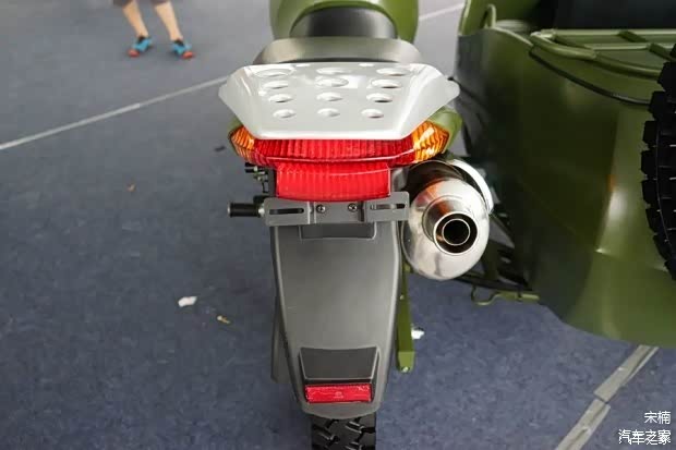 上图是JH600BJ型边三轮摩托后组合灯以及置物架特写。位于后排置物架下端的碟形组合灯,具备转向、制动指示功能;组合灯下加装了一具雾灯;后挡泥板镶嵌了一只反光板。