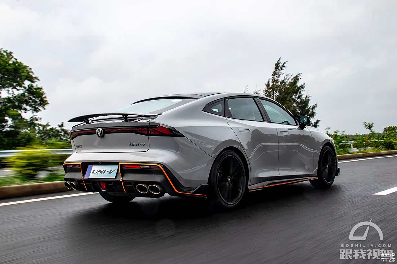 最后就是作为一辆运动型轿跑车,长安UNI-V运动版车型在日常驾驶中也能听到明显的排气管“放炮声”,虽然声音并没有那么大,但浑厚的排气声浪还是能让大家感到兴奋的。另外就是电动尾翼,虽然普通道路上很难察觉出尾翼带来的下压力,但高速上带来的沉稳车身姿态和稳扎稳打的悬架支撑性也不能说没有尾翼的功劳,只是二者结合确实能到达颜值和操控上的高水平和高回头率。