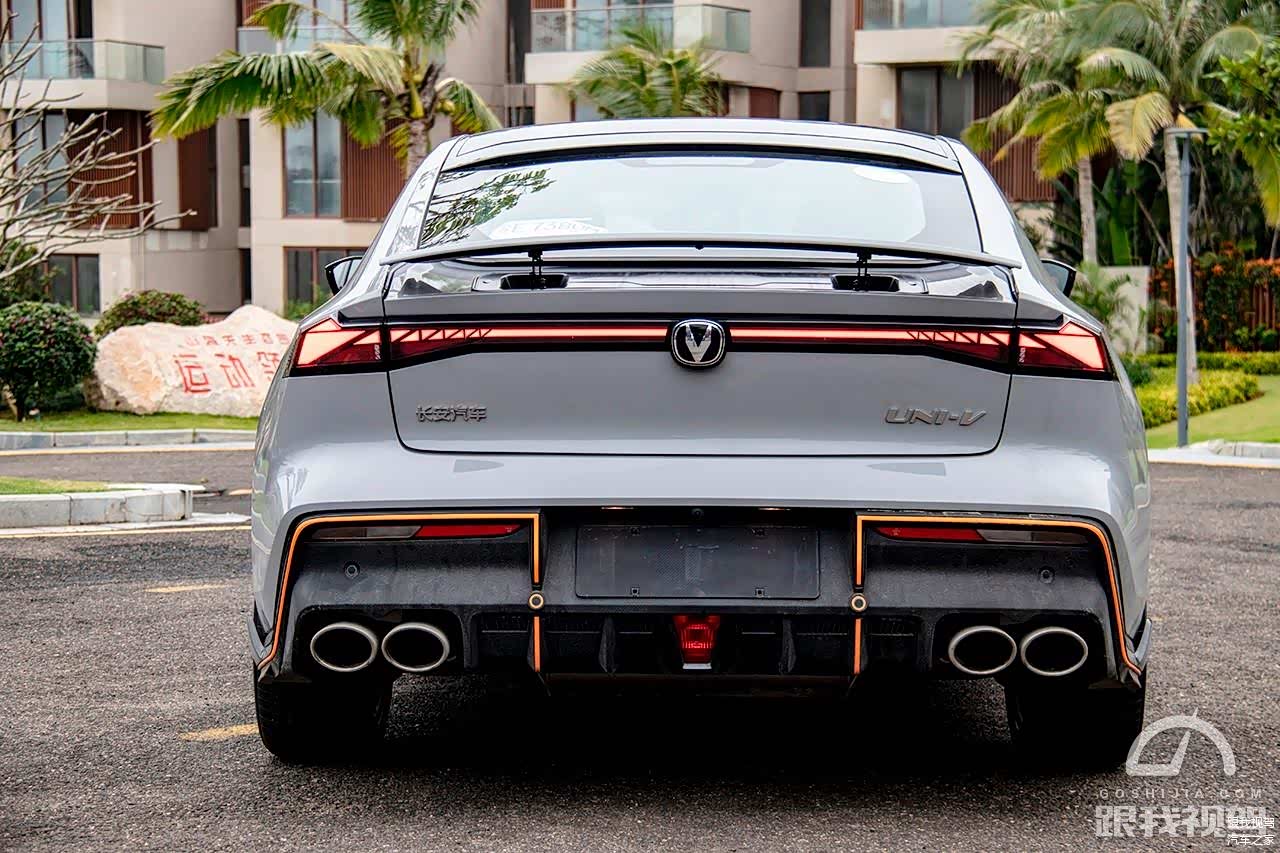 来到车尾之后,我觉得长安UNI-V做的要比其它车型更出色,甚至整个尾部所营造的运动氛围要超过领克03+等一众钢炮车型,至少在气势上能形成绝对的碾压之势,左右对称的双边共四出椭圆型排气管就不提了,其采用的电动升降尾翼就足以让人羡慕,并且它可以在低速手动开启或者时速超过80km/h自动开启。