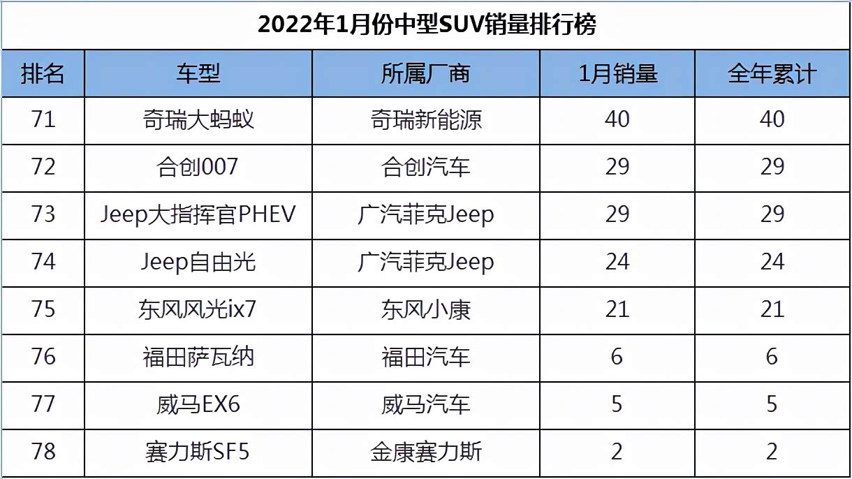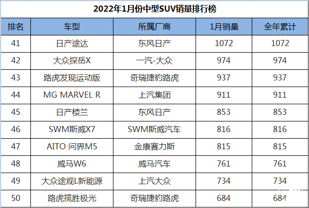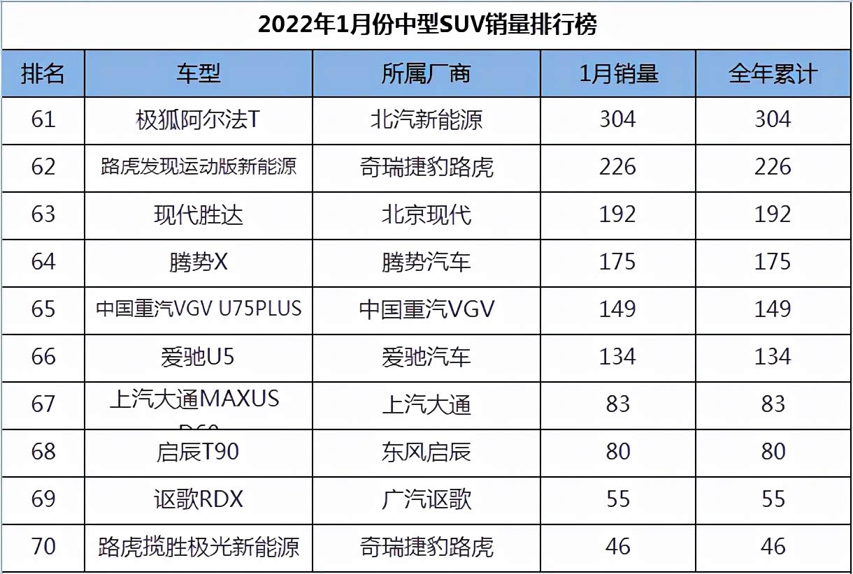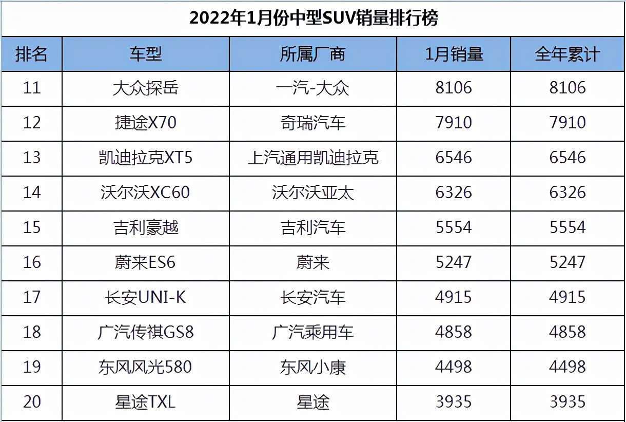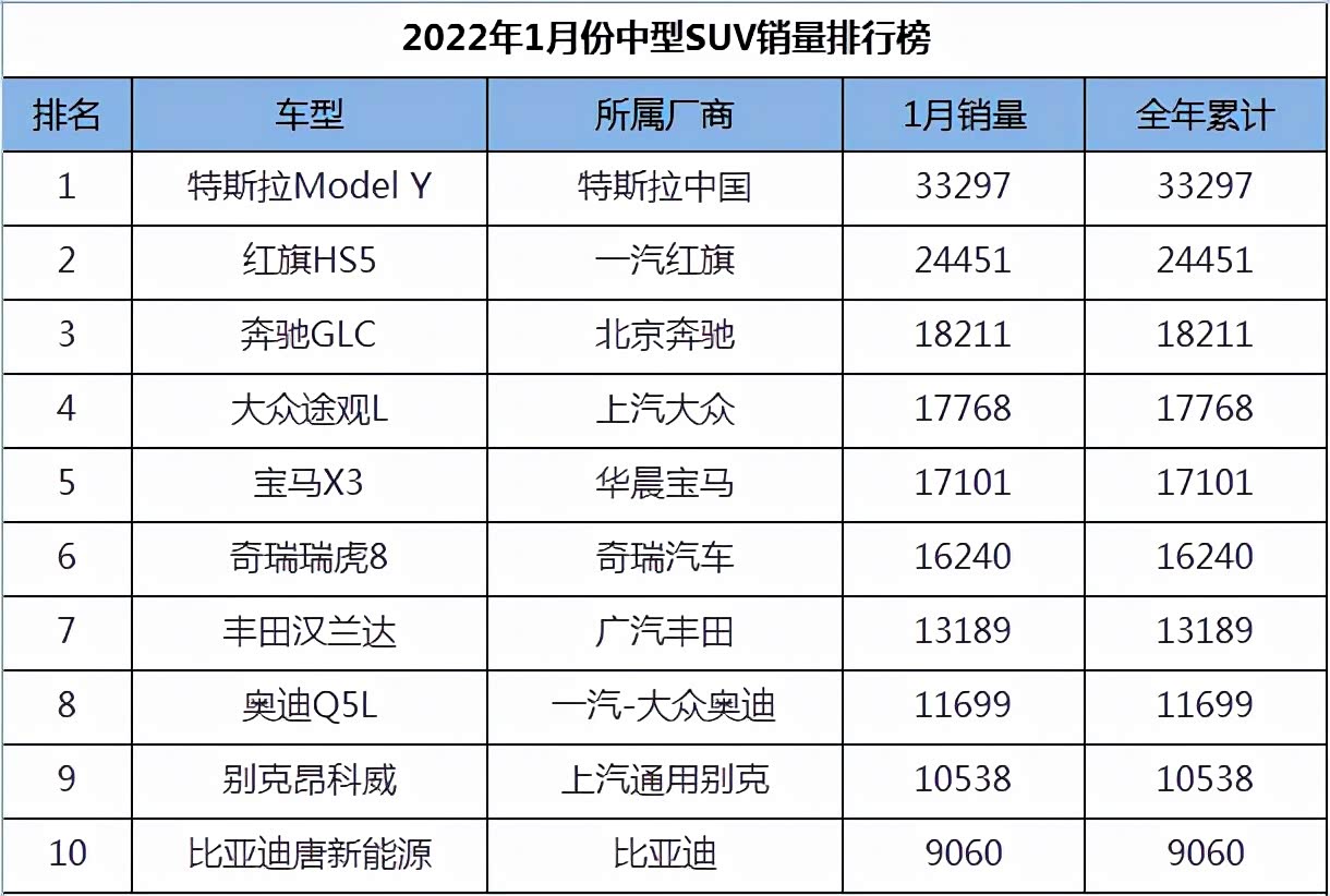 今天为大家带来2022年1月份国内市场中型SUV的销量排名情况!从数据上看,特斯拉Model Y在1月份卖出33297辆,以绝对的优势夺得了冠军,尽管很多人对于特斯拉的做工质量还表示怀疑,不过Model Y自从上市销量却一路高歌,主要原因还是在实现国产之后特斯拉的价格比较亲民,而且品牌形象并不比BBA这样的传统豪华品牌逊色,开出去还能给人一种时尚、前卫的感觉。