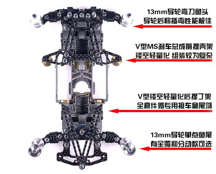 记不记得四驱车有马达在前的,比如巨无霸,而主流的都是马达靠后,比如蜘蛛侠和魔鬼司令?四驱车就像真车一样有平台与底盘,2005年推出的MS及2008年推出的MS-L底盘,让避震的改装开始流行,底盘经过切割后可在前后加入弹簧,就像真车的避震一样。车在跑道中跳跃后,可以大幅减少落地后二次跳跃的幅度。