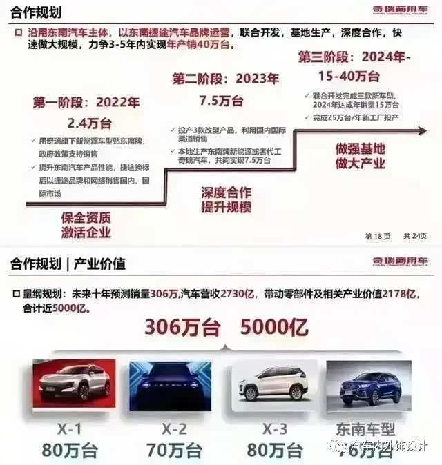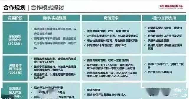 上述网传的PPT透露了奇瑞商用车与东南汽车合作未来3年的规划,包括销量目标、渠道、新工厂及车型等。从PPT内容来看,奇瑞和东南汽车之间的合作更像是福建省与奇瑞之间一场对赌协议。
