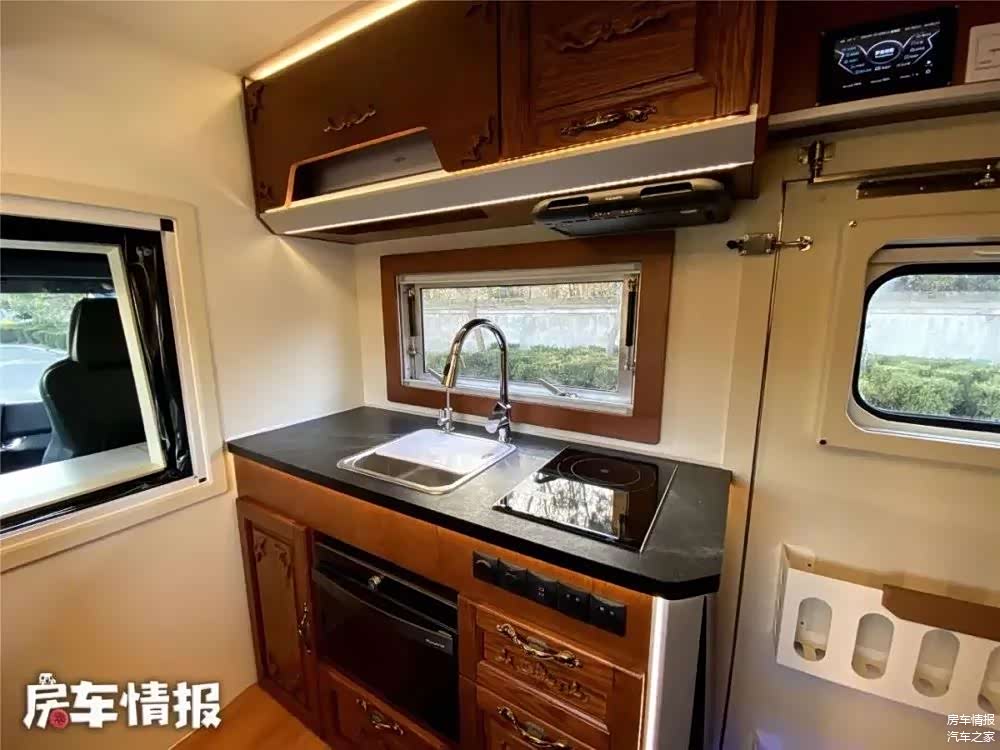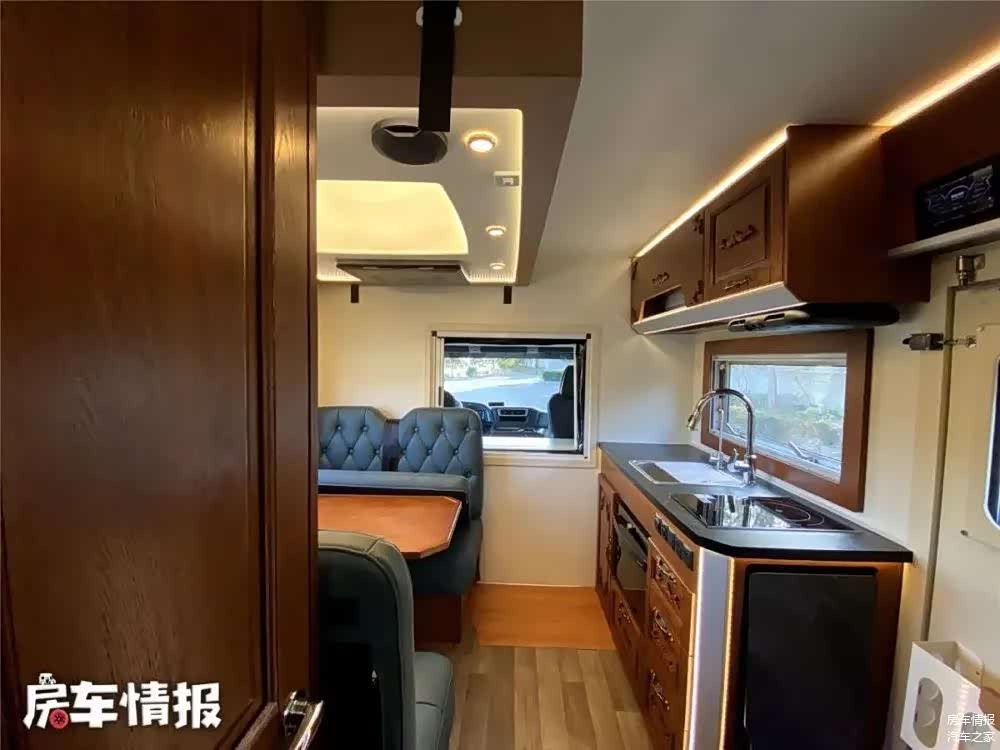 整辆车内部的家具都采用了红木材质,所以看起来相当的豪华贵气,尤其是乘客门前方的厨房操作台,加入了雕花的面板使其看起来特别的精致,提供了洗菜池、电磁炉、抽油烟机、蒸烤一体机以及一个直饮水出口。