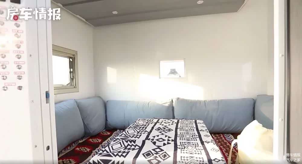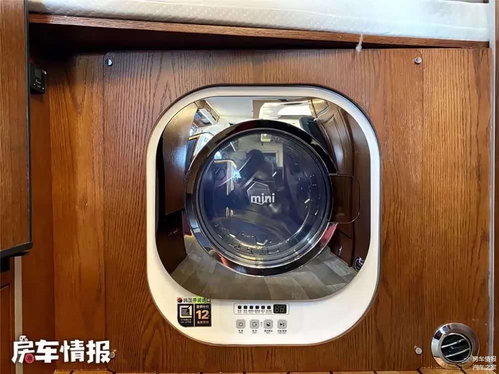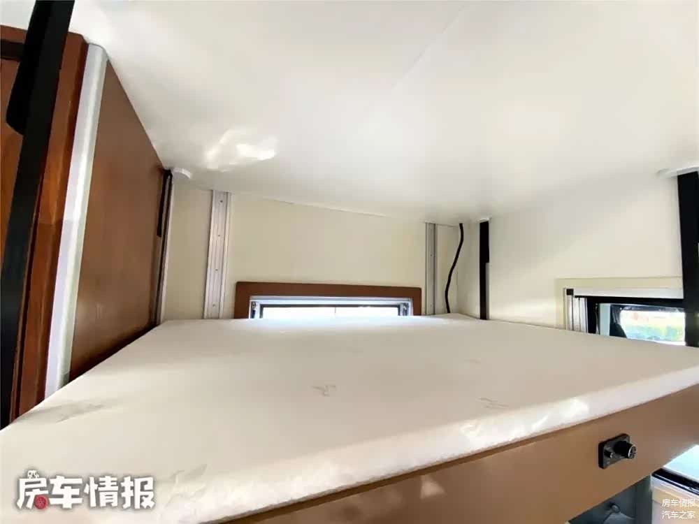 车厢尾部是整车的休息区,采用了上下床的设计,上层床尺寸约为2300*850mm,下层床尺寸为2000*1100mm,床铺下方还提供了一台小型的洗衣机,可以洗一些轻薄的贴身衣物。