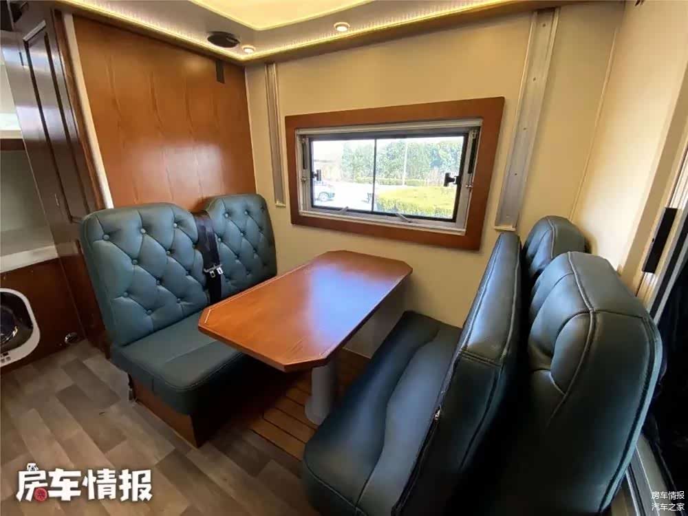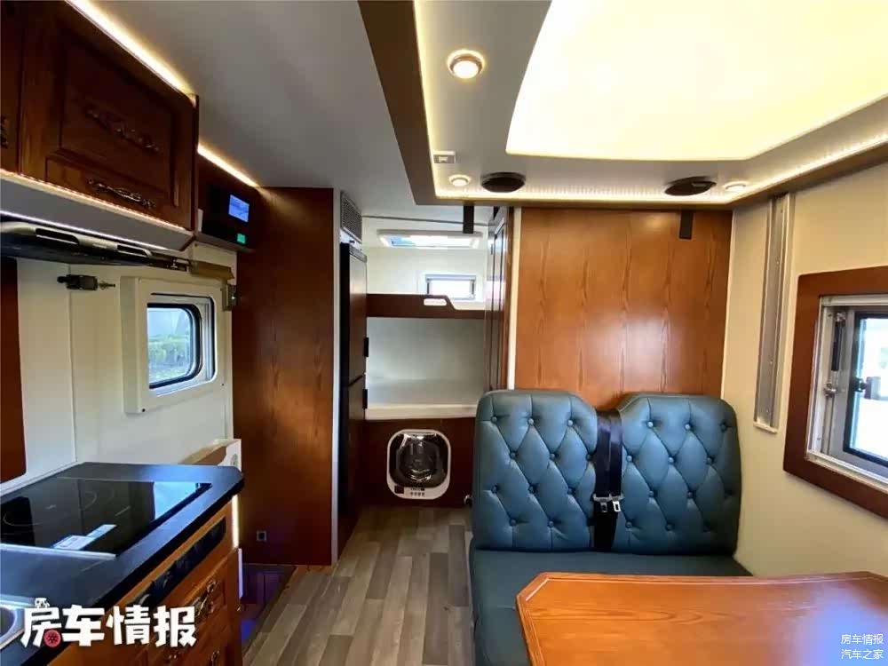 虽然说整辆车的外观很唬人,但是内部的空间表现和我们常见的C型房车相差无几,整车采用了后横床的布局设计,最前方是整车的会客区域,采用经典的四人对卡座沙发+升降餐桌的设计,晚上则可以拼成一张1800+1050mm的单人床,另外在会客区的顶部还藏有一台尺寸为1800*1250mm的电动升降床。