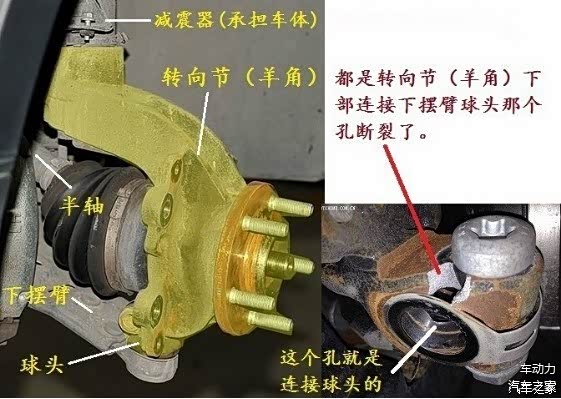 目前在中国市场上断轴的车型大体分为两种,一种是前轮断轴,以日系、美系和自主的几款车型为代表;一种是后轮“断轴”(为什么要加引号,我们在下文中会解释),以德系某神车为代表。其中前轮出现断轴的原因主要是由于转向节球头强度不足。至于到底是哪些车型发生过断轴,这就不用小编来说了,度娘一下什么都知道了。