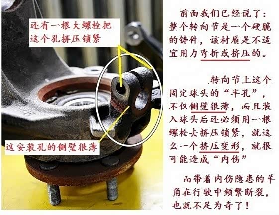 为什么会出现这种情况?比如说,一款美系SUV和一款轿车基于同一平台开发,由于SUV重了接近400公斤,却采用了相同的转向节,没有在转向节球头的设计上进行加固和强化,整车质量增加后,当司机开车减速转弯时,产生的惯性SUV大得多,极易对球头内部的金属件造成损伤,引发断轴隐患。这就是为什么采用同样的转向节,在轿车上没见着有断轴,在SUV上却断个没完没了的原因。