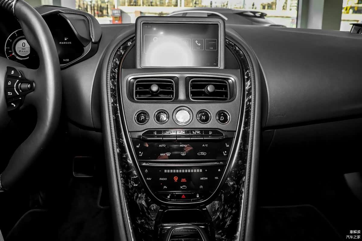 接着在内饰部分,阿斯顿·马丁DBS也是有着和外观气质相符合的运动豪华感,中控台是采用了跑车常用的T型布局,并且使用了大面积的真皮材质覆盖,辅以碳纤维材质的装饰,坐进去的驾乘质感是很细腻舒适的。阿斯顿·马丁DBS中部配备了一个8英寸中控屏,支持卫星导航、语音控制功能,还可以选装CarPlay,交互体验比较一般。而一些物理按键的保留,也方便驾驶员来进行盲操。