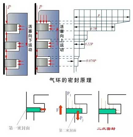 这三个间隙使活塞环与活塞、气缸壁之间形成了两个密封面和一个迷宫式的漏气通道,其中第一道气环大约密封80~90%的气体,第二道气环大约密封10~20%的气体,油环大约密封5%的气体。再加上高压气体的二次密封作用,最终从燃烧室泄漏到曲轴箱的气体只有进气量的0.2%~1.0%,密封是比较成功的,这也是往复活塞式发动机至今仍有强大生命力的重要原因之一。