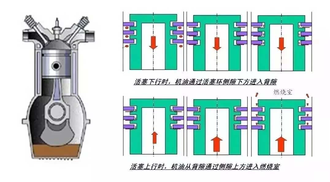 此外,由于活塞环有“三隙”,它在气缸中上下往复运动。当活塞在气缸中向下运动时,气缸壁上的机油就通过活塞环的侧隙下方进入背隙;当活塞在气缸中向上运动时,背隙中的机油就会进入侧隙上方,然后被送入燃烧室参与燃烧;这个现象在发动机运转过程中反复不断的进行,机油就被逐渐的消耗掉了。这种现象称为“活塞环泵油作用”,这是往复活塞式发动机固有的特性之一,任何品牌和型号的发动机都会消耗机油,只是程度不同而已。活塞环的三隙越大,泵油作用越强烈,消耗的机油越多。发动机在使用过程中,由于磨损会导致三隙越来越大,所以机油消耗量也会越越来越多。