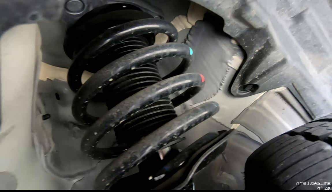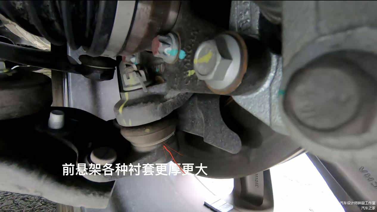 包括车上各个连接的衬套处理。 比如前悬架因为承担前驱,更加偏向操控,所以衬套做的更大更硬。后悬架因为后排乘客对舒适性和NVH的诉求更强一点,所以衬套就更偏向阻尼调教。