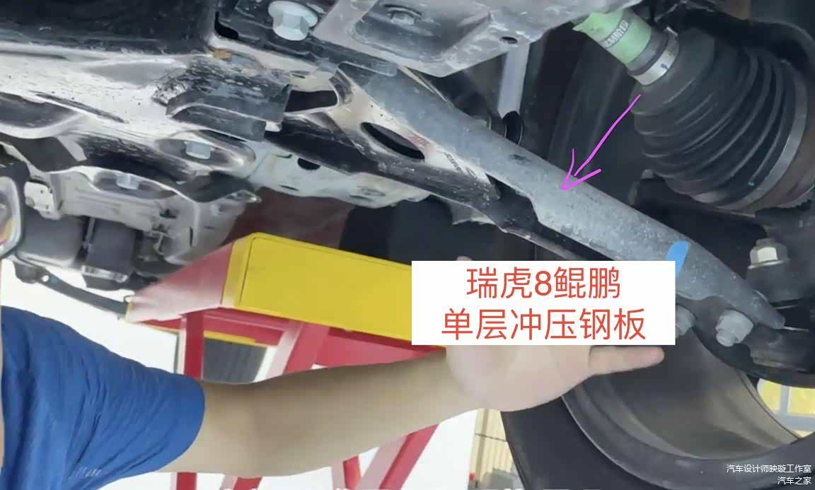 前后悬架的下摆臂,采用的是双层钢制冲压件,要比瑞虎8鲲鹏版那个卷边儿的单层冲压件要厚实,副车架也是全框式的,也比虎8鲲鹏版的H型更结实。下摆臂虽然不如铝合金轻量化,但是通过打孔减重,对这个12-15万级别的车型来说,还是要节省成本的。转向节,是铝合金的,不错。
