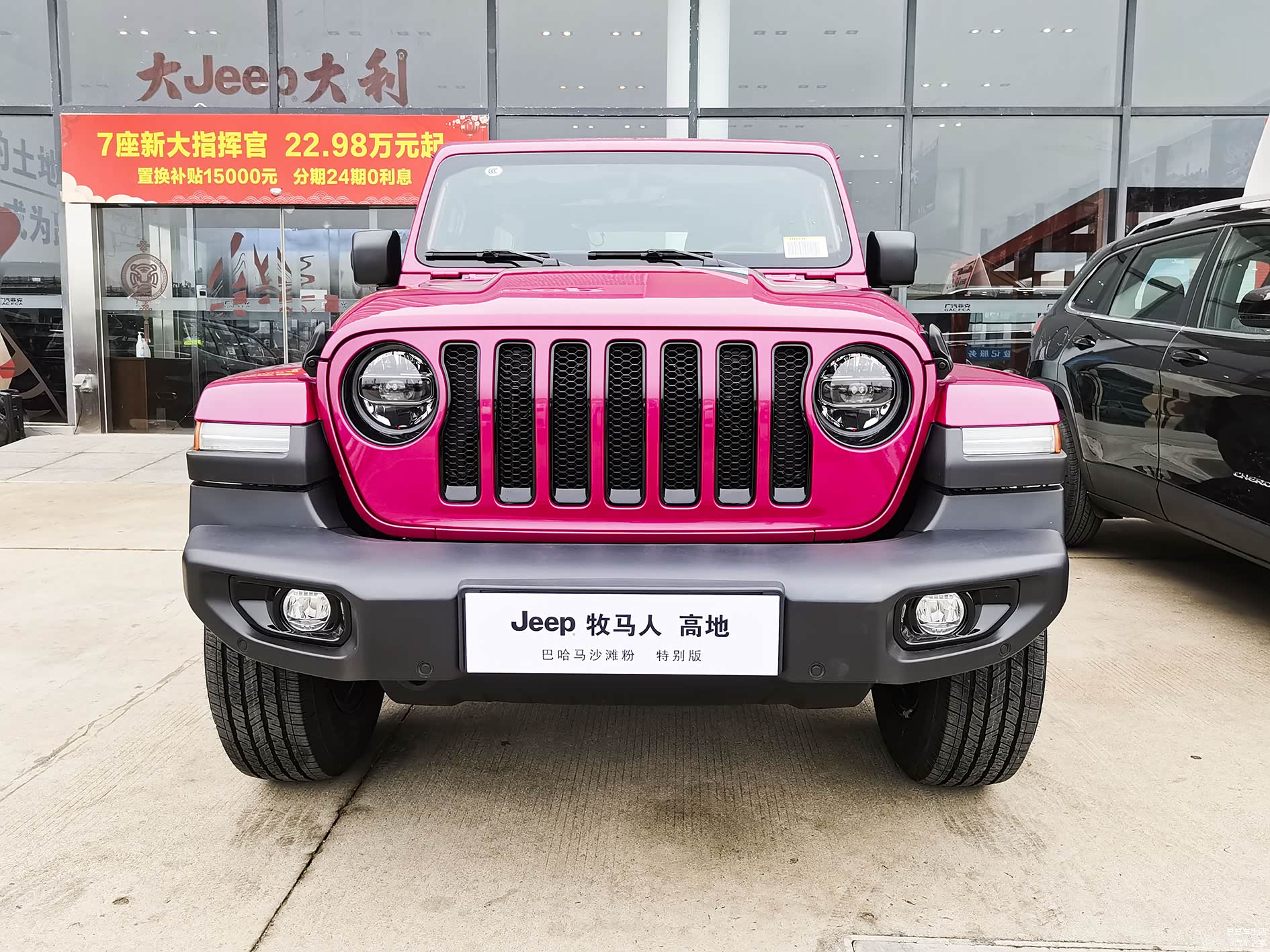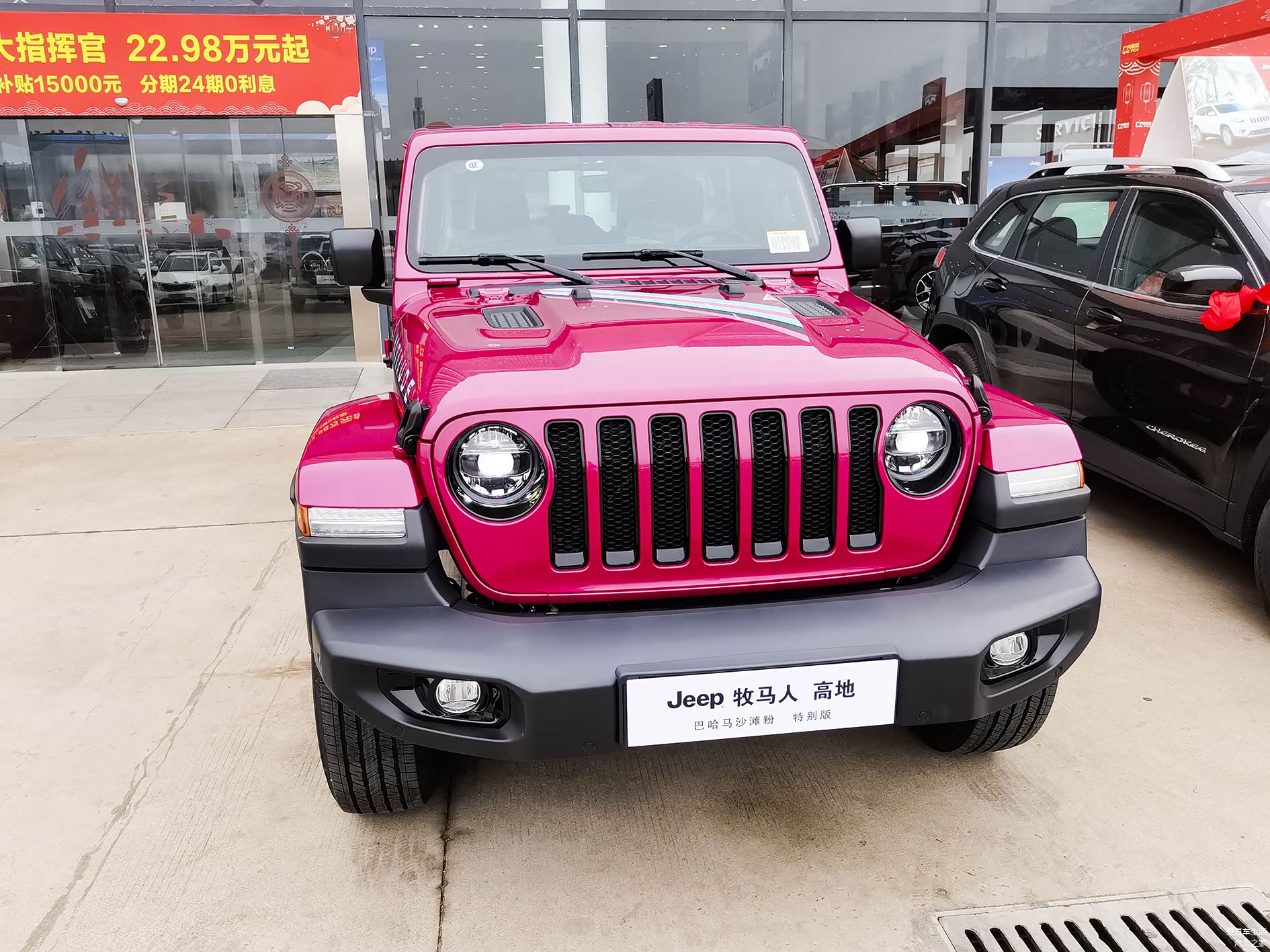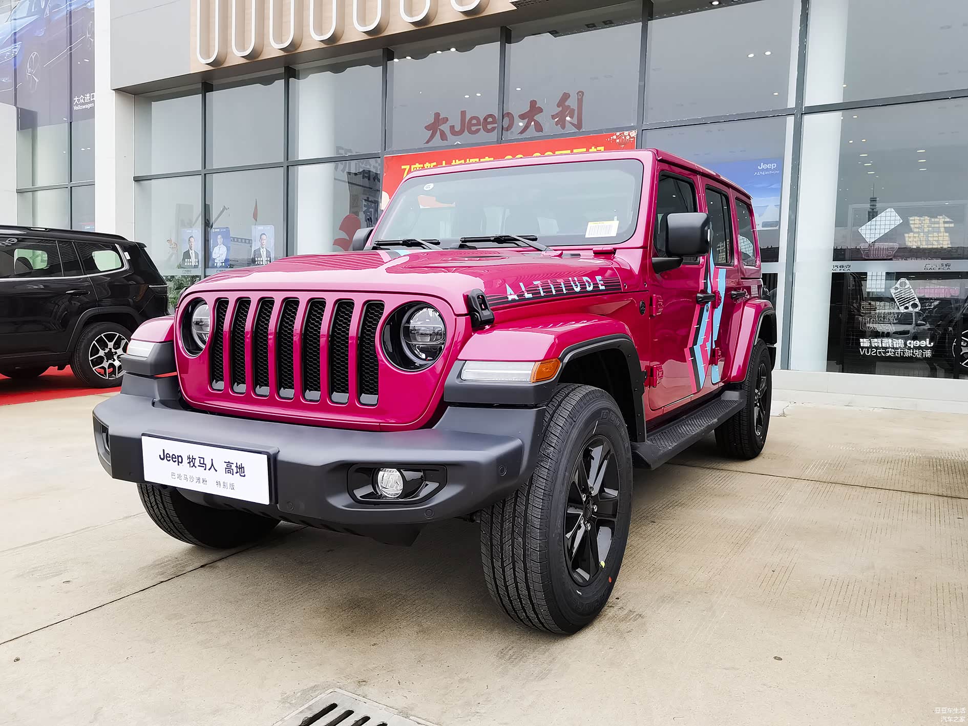 牧马人高地巴哈马沙滩粉是用高地版的配置推出的,说到高地版,很多人都很懵,因为牧马人每年都在推陈出新,很多人都没听说过新车的型号就过时了,在这里窦豆先生给大家科普一下,牧马人之前的撒哈拉四门版是45.99万元,在去年的时候厂家在45.99万元的基础上,将轮圈改为黑色,同时增大了中控屏,前七孔格栅增加了黑色的设计,在小范围改动的基础上,推出了高地版,价格为48.99万元,相当于牧马人的撒哈拉版本贵了3万元,这款巴哈马沙滩粉是在高地版基础上推出的新的色系,粉色的车,全国限量180台,价格为50.99万元,首批车型,需要在吉普的大J大礼小程序上抢订,数量为100台;后期有80台可以在店里购买,当然,加不加钱就看店里的了。每个地方都不一样。