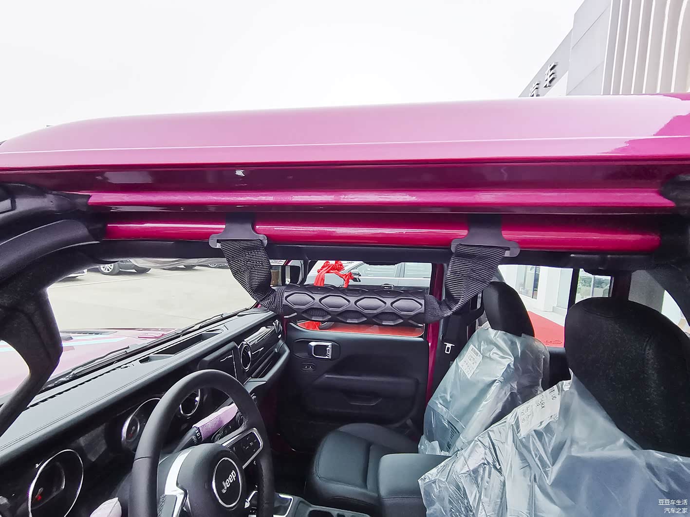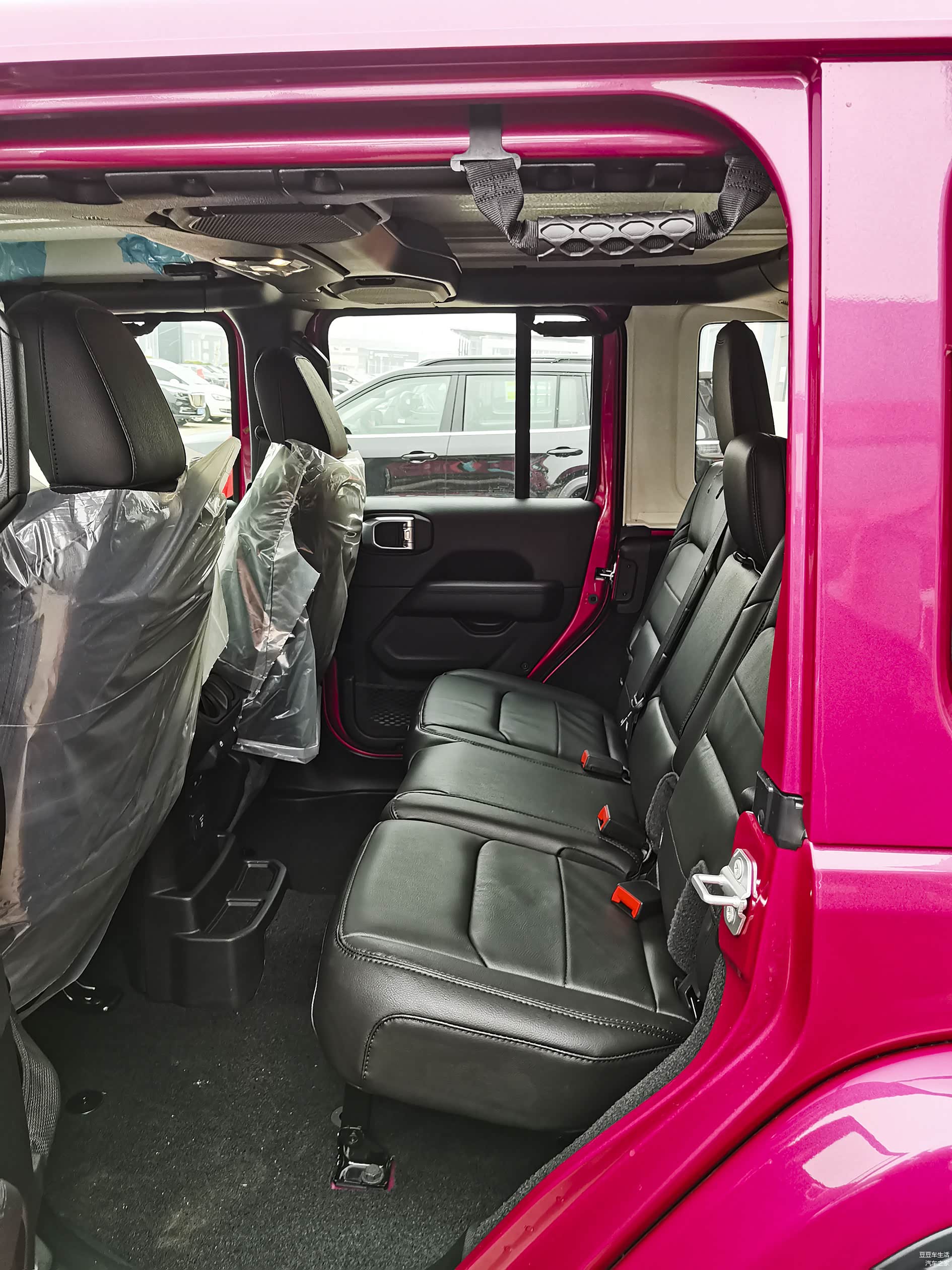 白色的硬质备胎罩是这个车的亮点之一,其它配置的牧马人都是皮的备胎罩,这个是白色的,在路上回头率是够了。粉色加白色的搭配是很有亮点的