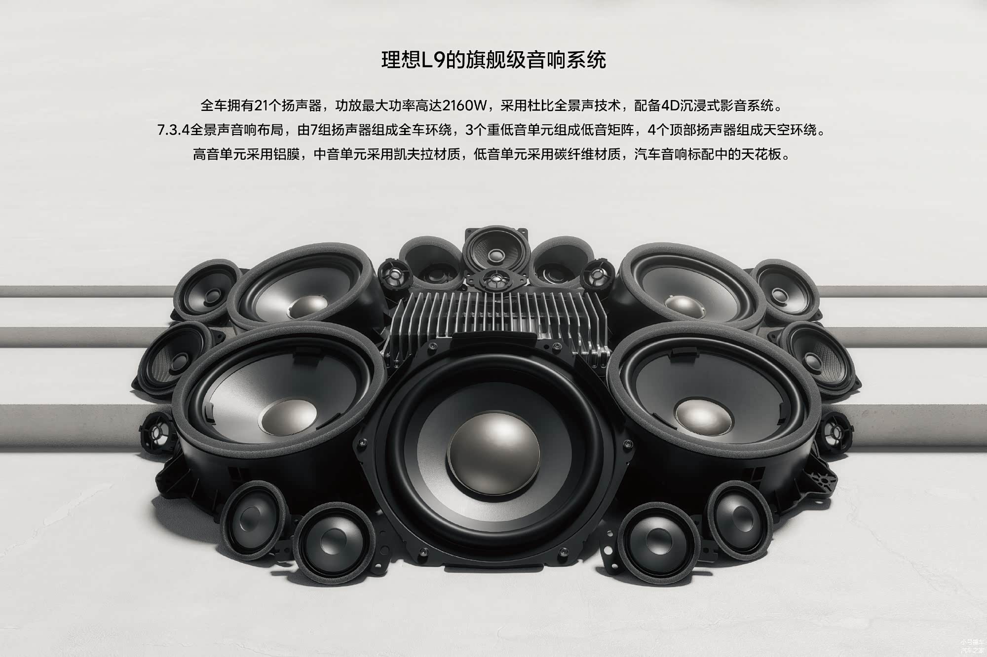 官方称,理想L9采用的是7.3.4全景声音响布局,由7组扬声器组成全车环绕,3个重低音单元组成低音矩阵,4个顶部扬声器组成天空环绕,而且支持杜比全景声技术。