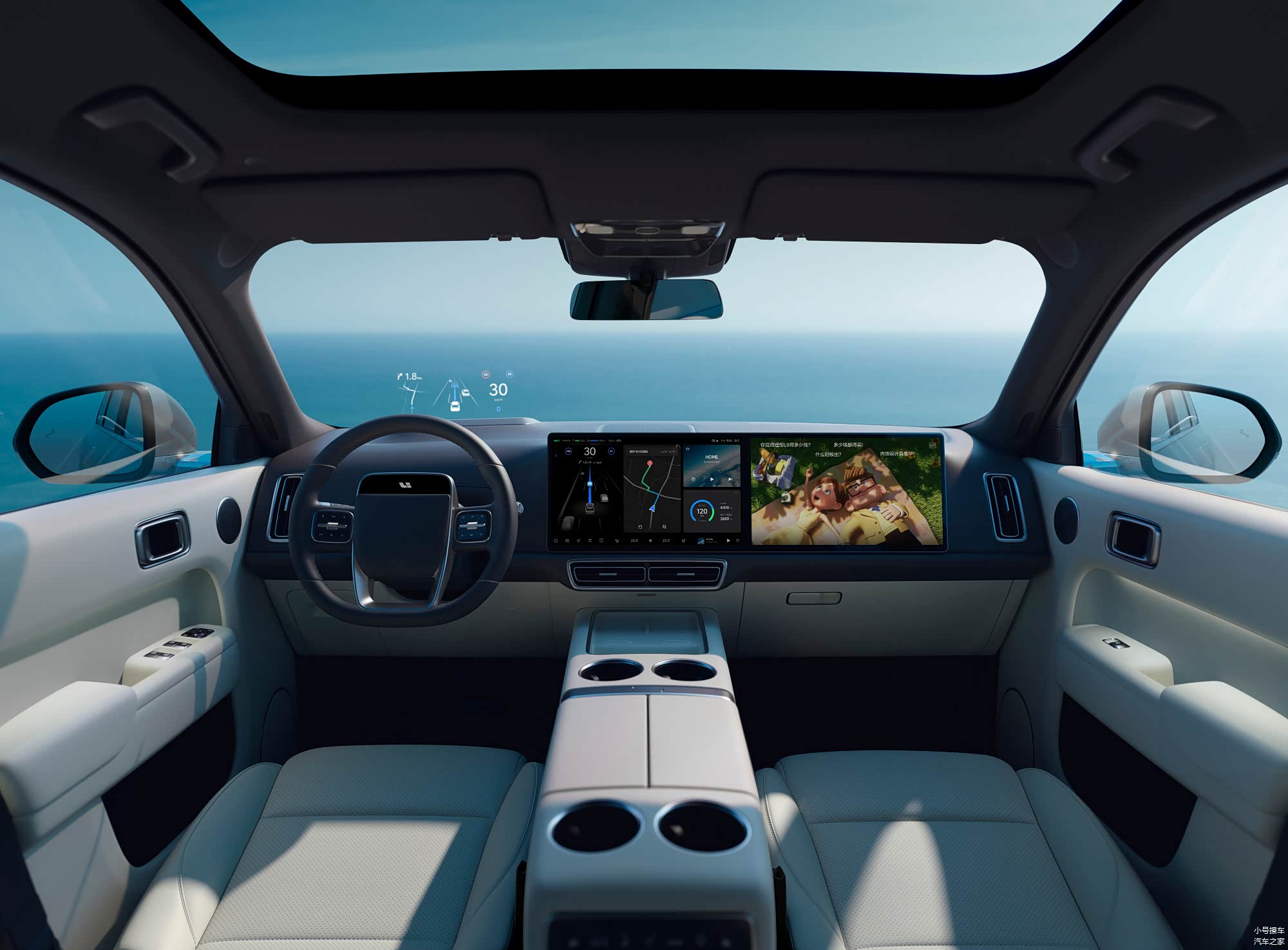 内饰方面,新车采用的是比较简洁的设计语言,提供有HUD抬头显示、贯穿式双联屏(中控屏+副驾驶娱乐屏)、三辐式多功能方向盘以及安全驾驶交互屏。车顶还配备有一块可折叠的屏幕,可供后排乘客观看视频使用。