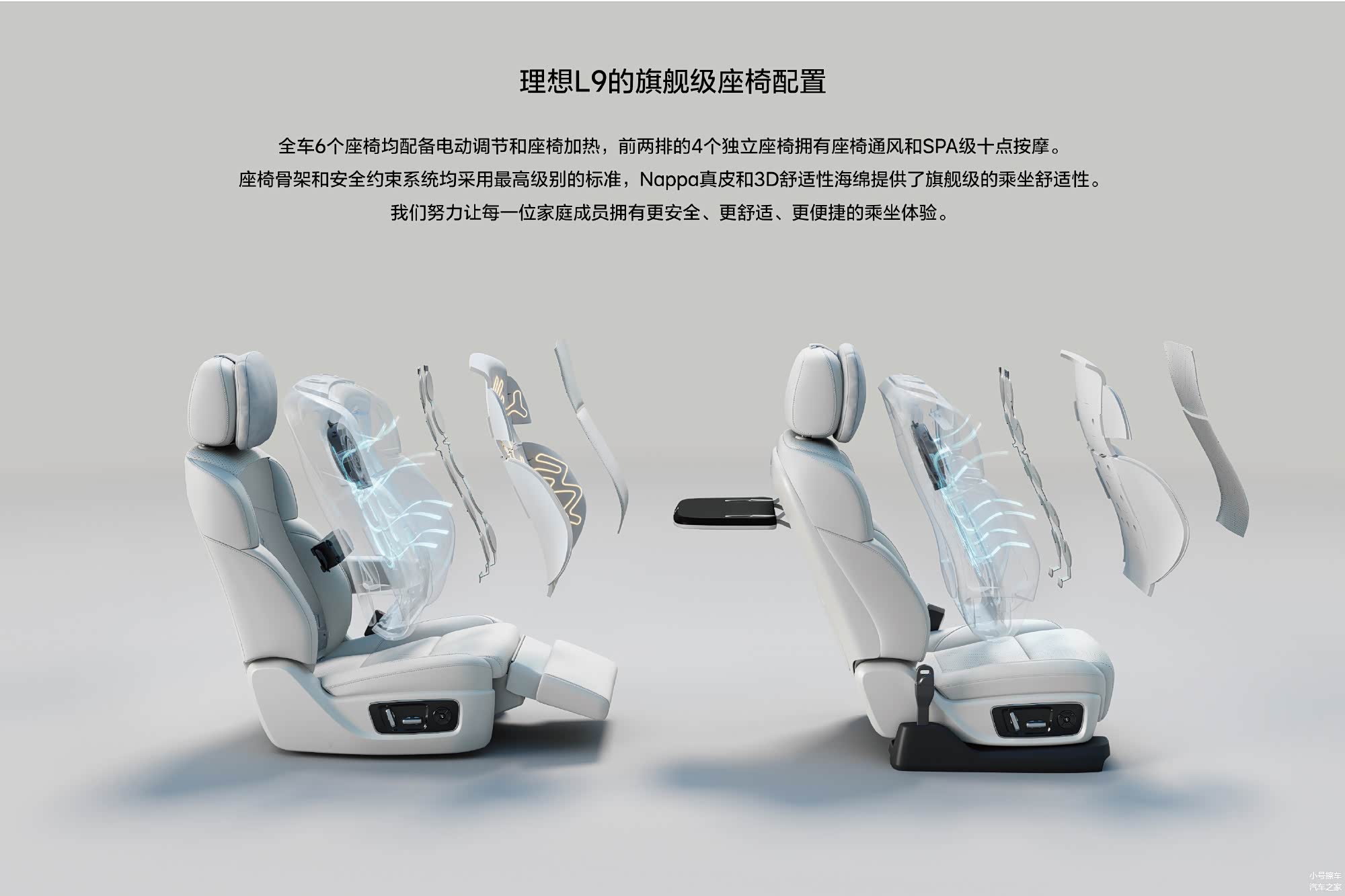 座椅方面,理想L9采用的是2+2+2的六座布局,均支持电动调节和座椅加热功能,而且前两排的4个座椅还加入了通风功能。