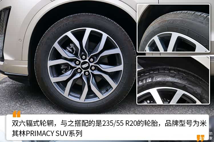有了运动套件加持,试驾车行李架也采用黑色涂装,车窗四周也是黑色饰条装饰,另外,第二、三排车窗还配备了隐私玻璃。轮辋部分,XT6搭配的是双六辐式轮辋,与之搭配的是235/55 R20的轮胎,品牌型号为米其林PRIMACY SUV系列,具备良好的湿地稳定性、更短的刹车距离和静谧性,目前某东价格在1800元/条左右。另外,侧裙位置有一条镀铬装饰的饰条,还印有XT6的字样,让侧面的精致豪华感得到了提升。