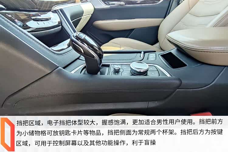 挡把区域,电子挡把体型较大,握感饱满,更加适合男性用户使用。挡把前方为小储物格可放钥匙卡片等物品,挡把侧面为常规两个杯架。挡把后方为按键区域,可用于控制屏幕以及其他功能操作,利于盲操。
