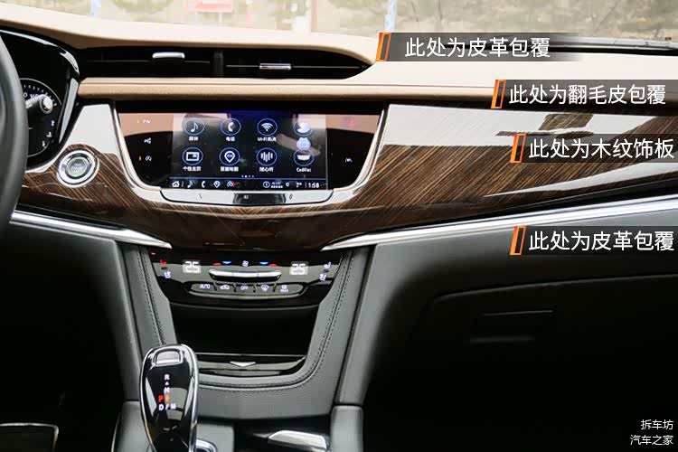 整个前排用料层面比较下本,大面积的皮革包覆,例如中控台上方皮革包覆,中控正面是大面积的深色木纹装饰,木纹表面进行了特殊处理,防止刮伤。正面木纹和上部皮革之间是翻毛皮的材质相接与边缘,更显豪华。