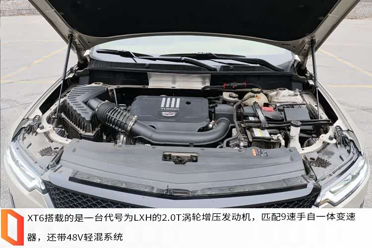 XT6搭载的是一台2.0T涡轮增压发动机,匹配9速手自一体变速器,自2021年2月之后上市的车型,全系增加48V轻混系统,此外2.0T发动机具备Tripower可变气门管理技术,使发动机在“四缸高性能模式”“四缸经济模式”“两缸超经济模式”之间平滑切换。整套系统的最大功率为174千瓦,最大扭矩为350牛米,官方零百公里每小时加速时间为8.8秒。