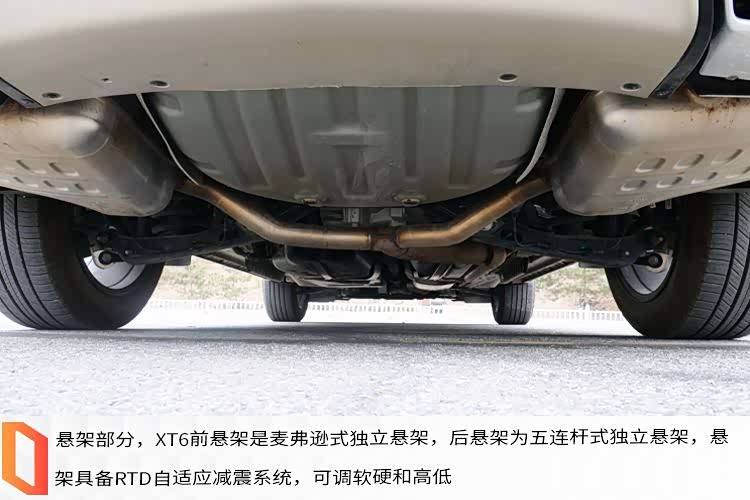试驾车还具备前置四驱系统,在0-100%的范围内,动态分配左右轮间的扭矩,提升了驾驶的灵活性和稳定性。悬架部分,XT6前悬架是麦弗逊式独立悬架,后悬架为五连杆式独立悬架,悬架具备RTD自适应减震系统,可调软硬和高低。