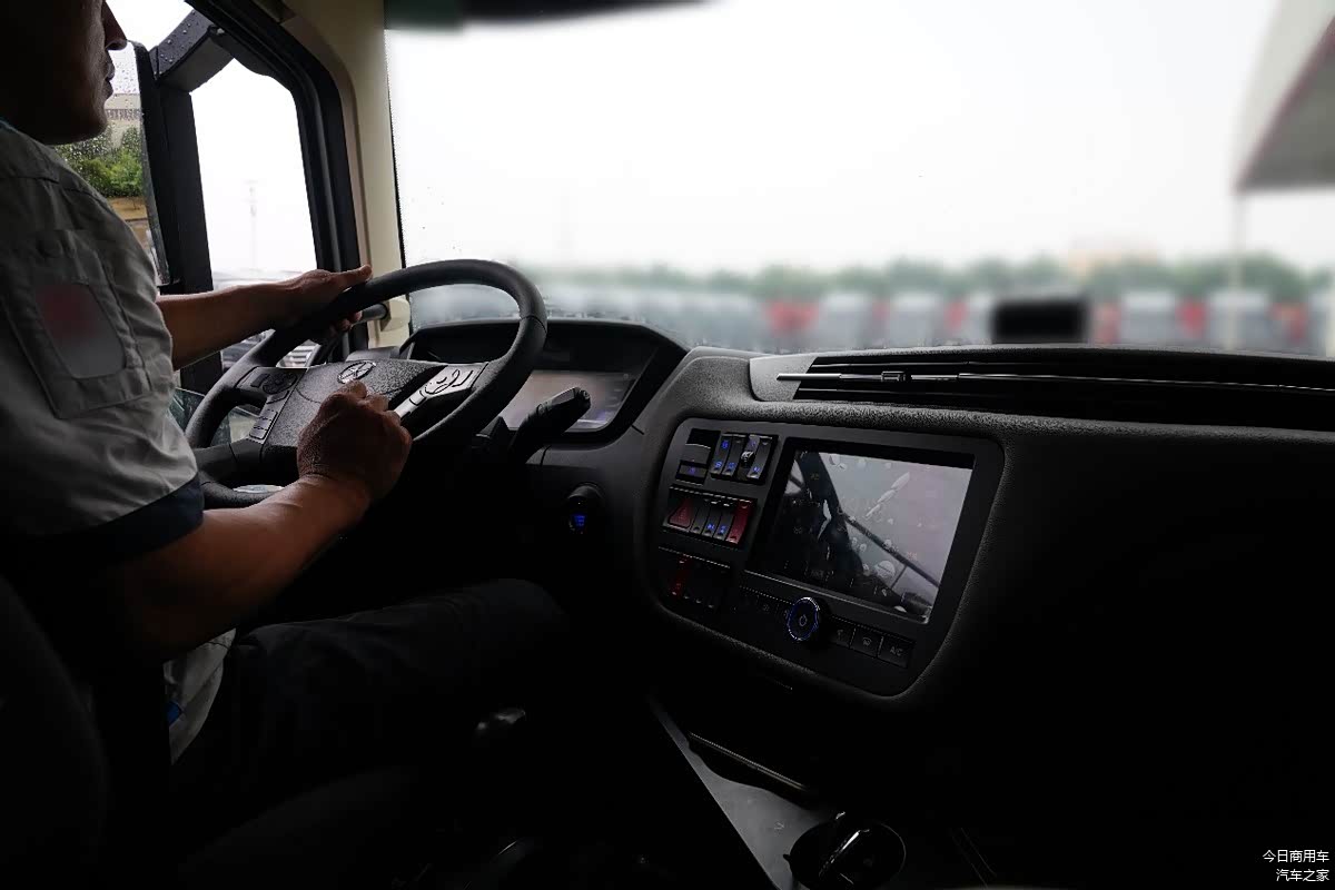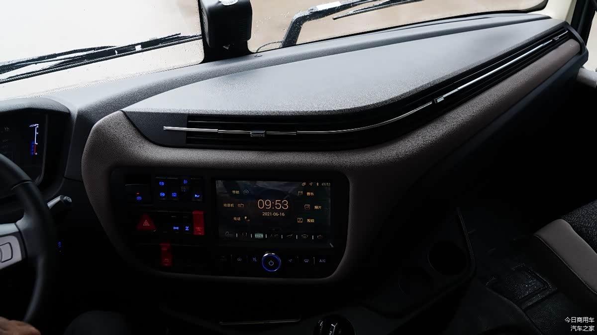 拉开车门,相信任何一个对重卡有些许了解的人都会发出惊叹,空调出风口化身为中控上部一道优美的线条,不使用时,就是一件精美的装饰品。中控大屏和各种功能按键都向驾驶位大幅倾斜,方便司机使用,但视觉效果毫不突兀,大屏后的线条向副驾自然的延伸,与L形中控整体的造型浑然天成。真皮包覆的方向盘上配齐了多媒体和定速巡航的控制按键,五幅的设计不是运动取向,但成熟稳重的造型,也能完美契合驾驶整体温馨舒适的氛围。