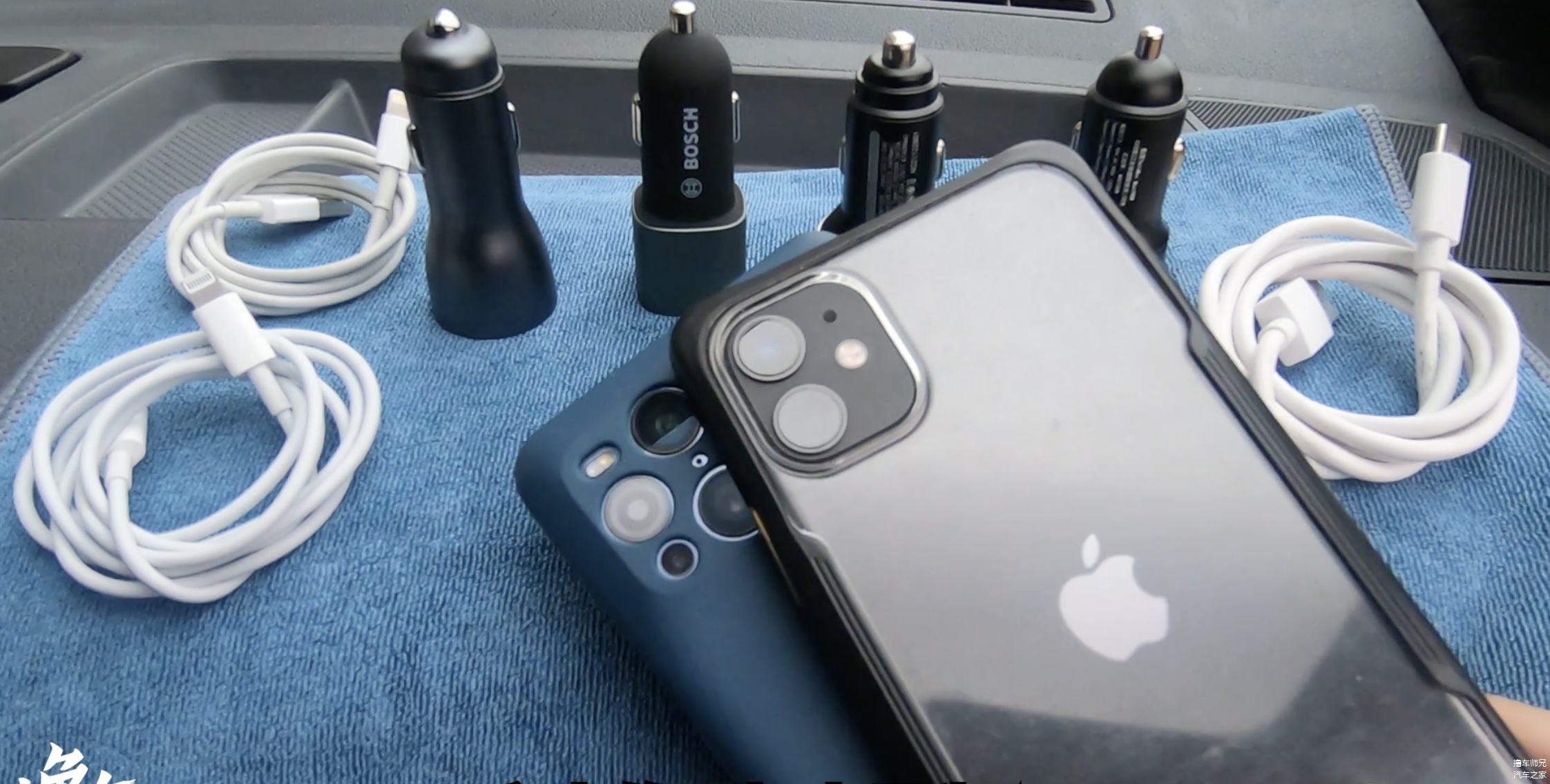 我分别用这4款车载充电器,在车辆稳定怠速的情况下,同时给iphone11以及oppo find x3充电,苹果的充电线为原装PD快充线以及iphone11的原装线,oppo也是原装线。