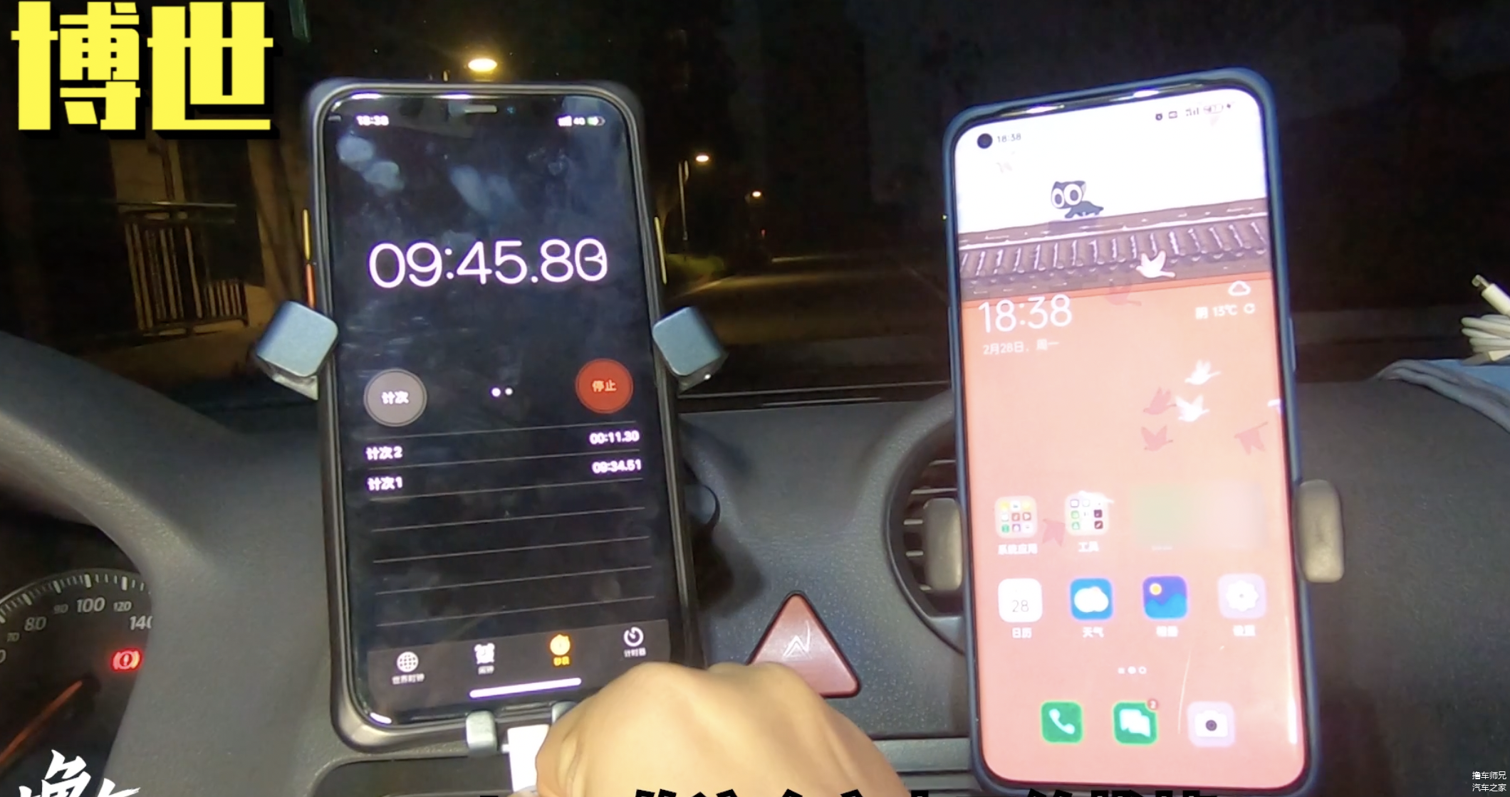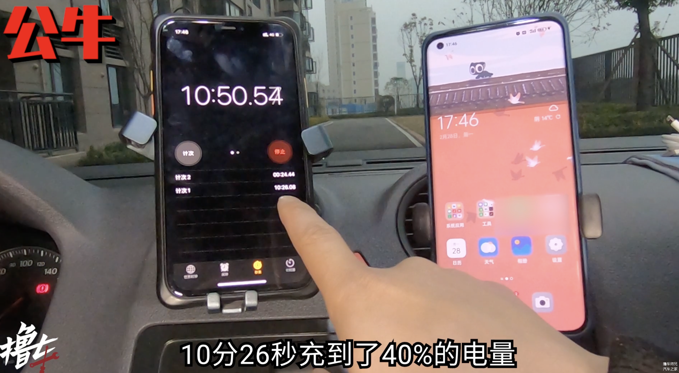 这次oppo从30%的电量充到40%,一共用时4分52秒,而iphone从30%的电量充到40%,用时13分30秒。
